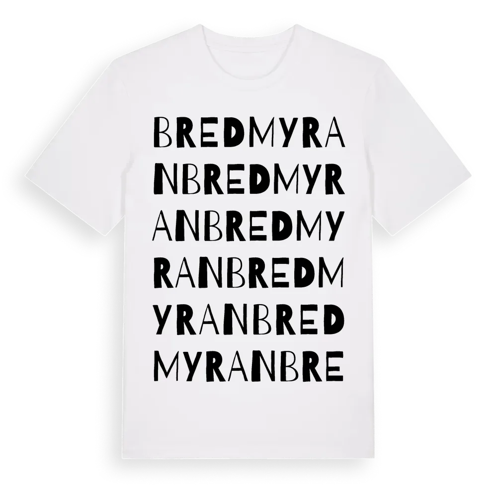 Bredmyran ordlek t-shirt är inspirerad av Bredmyran i Gävleborgs län, Sverige. Tröjan är designad för dig som har en speciell koppling till platsen – oavsett om du bor här, har rötterna här eller bara älskar Bredmyran.