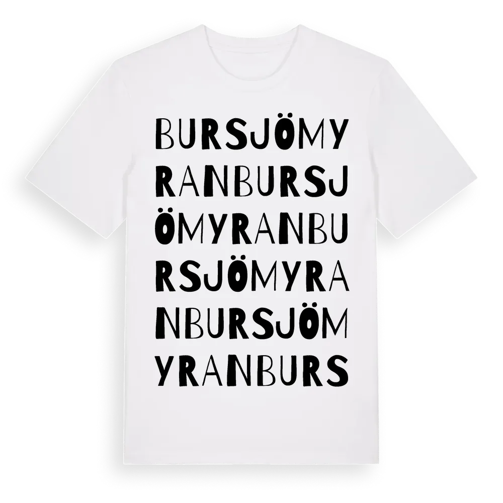 Bursjömyran ordlek t-shirt är inspirerad av Bursjömyran i Gävleborgs län, Sverige. Tröjan är designad för dig som har en speciell koppling till platsen – oavsett om du bor här, har rötterna här eller bara älskar Bursjömyran.