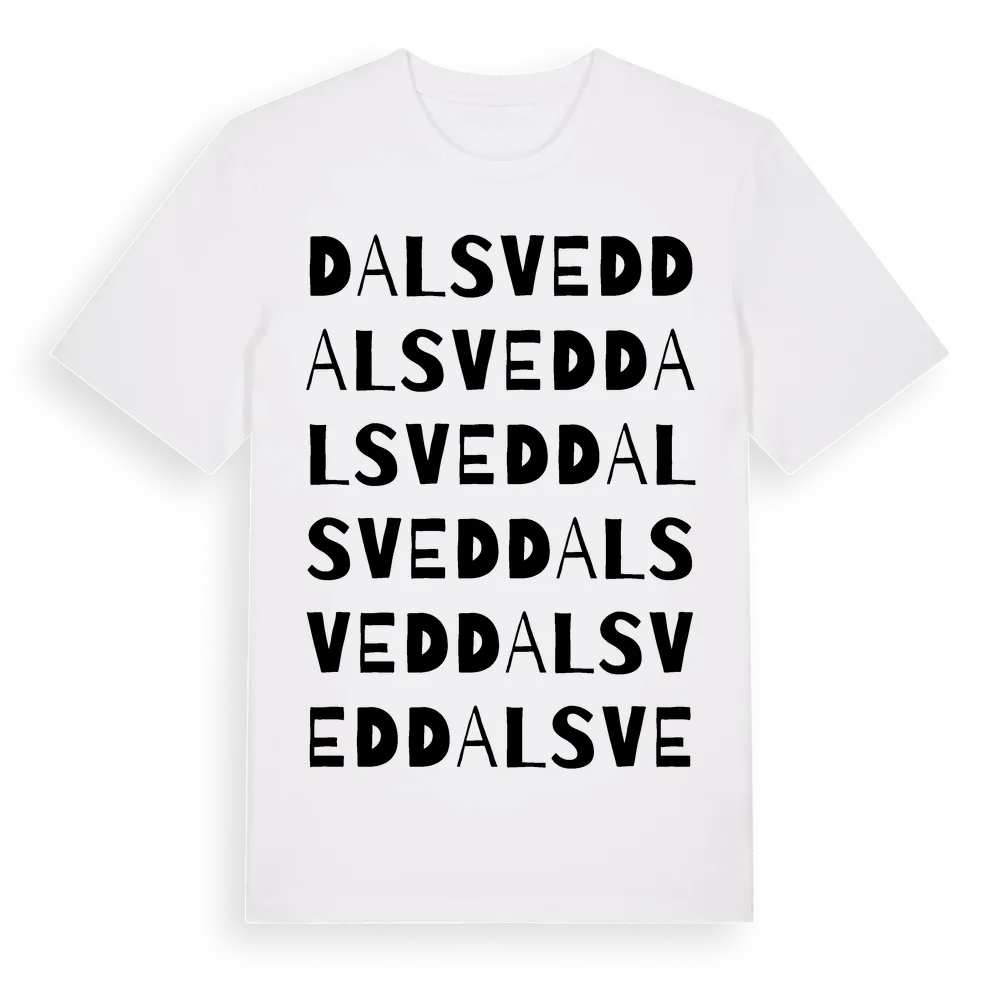 Dalsved ordlek t-shirt är inspirerad av Dalsved i Gävleborgs län, Sverige. Tröjan är designad för dig som har en speciell koppling till platsen – oavsett om du bor här, har rötterna här eller bara älskar Dalsved.