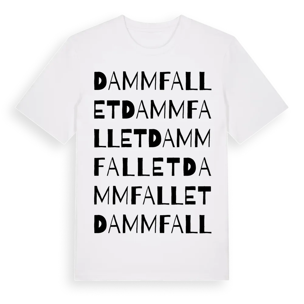 En ordlek byggd på Dammfallets namn. Subtilt och klurig – ett motiv som bara de som verkligen känner platsen fullt ut förstår. Premium bomull, unisex – från Dammfallet i Gävleborgs län.