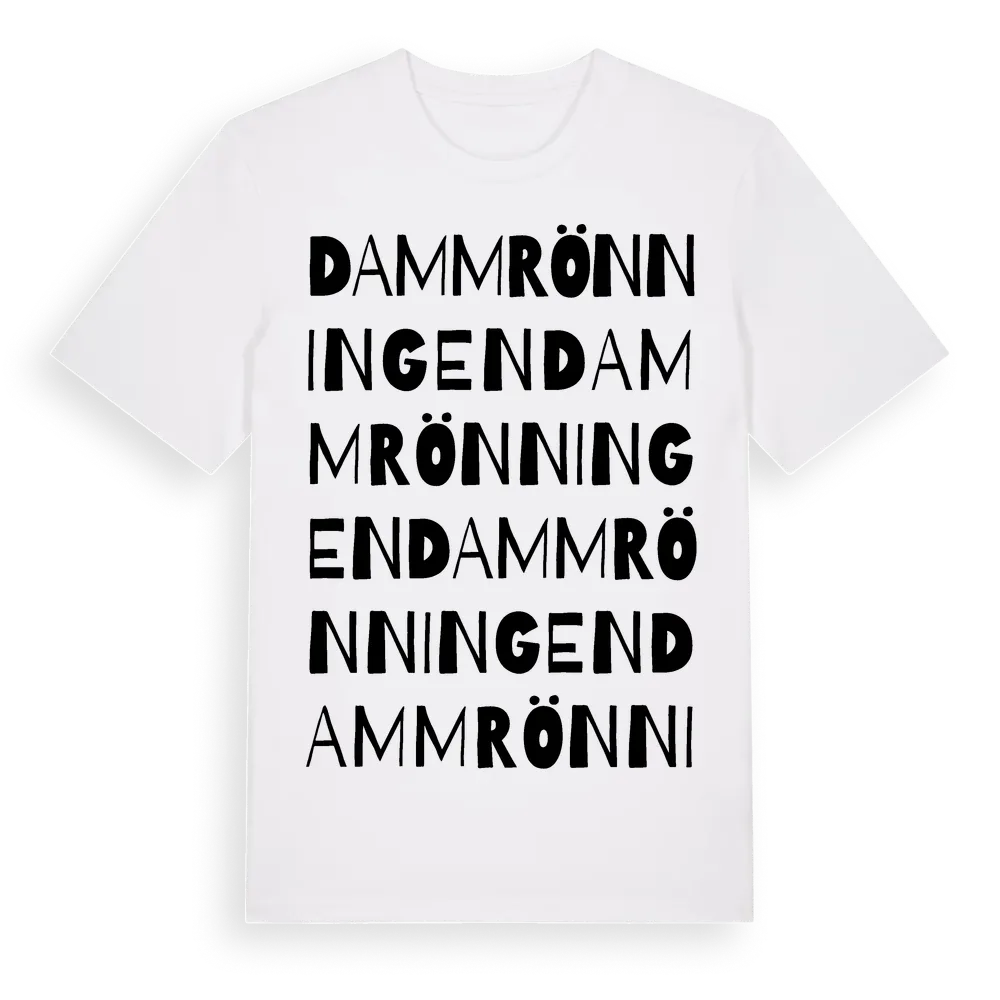 Dammrönningen ordlek t-shirt är inspirerad av Dammrönningen i Gävleborgs län, Sverige. Tröjan är designad för dig som har en speciell koppling till platsen – oavsett om du bor här, har rötterna här eller bara älskar Dammrönningen.