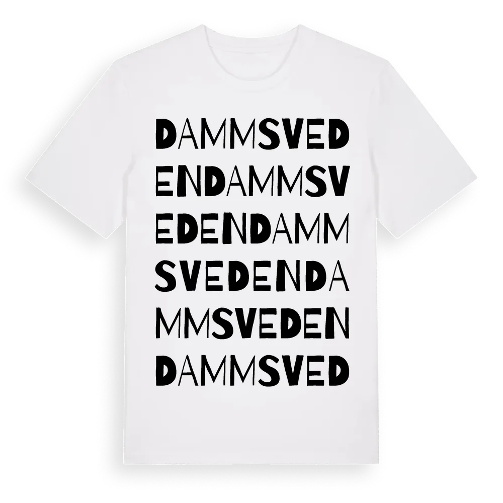 Dammsveden ordlek t-shirt är inspirerad av byn Dammsveden i Gävleborgs län, Sverige. Tröjan är designad för dig som har en speciell koppling till platsen – oavsett om du bor här, har rötterna här eller bara älskar Dammsveden.