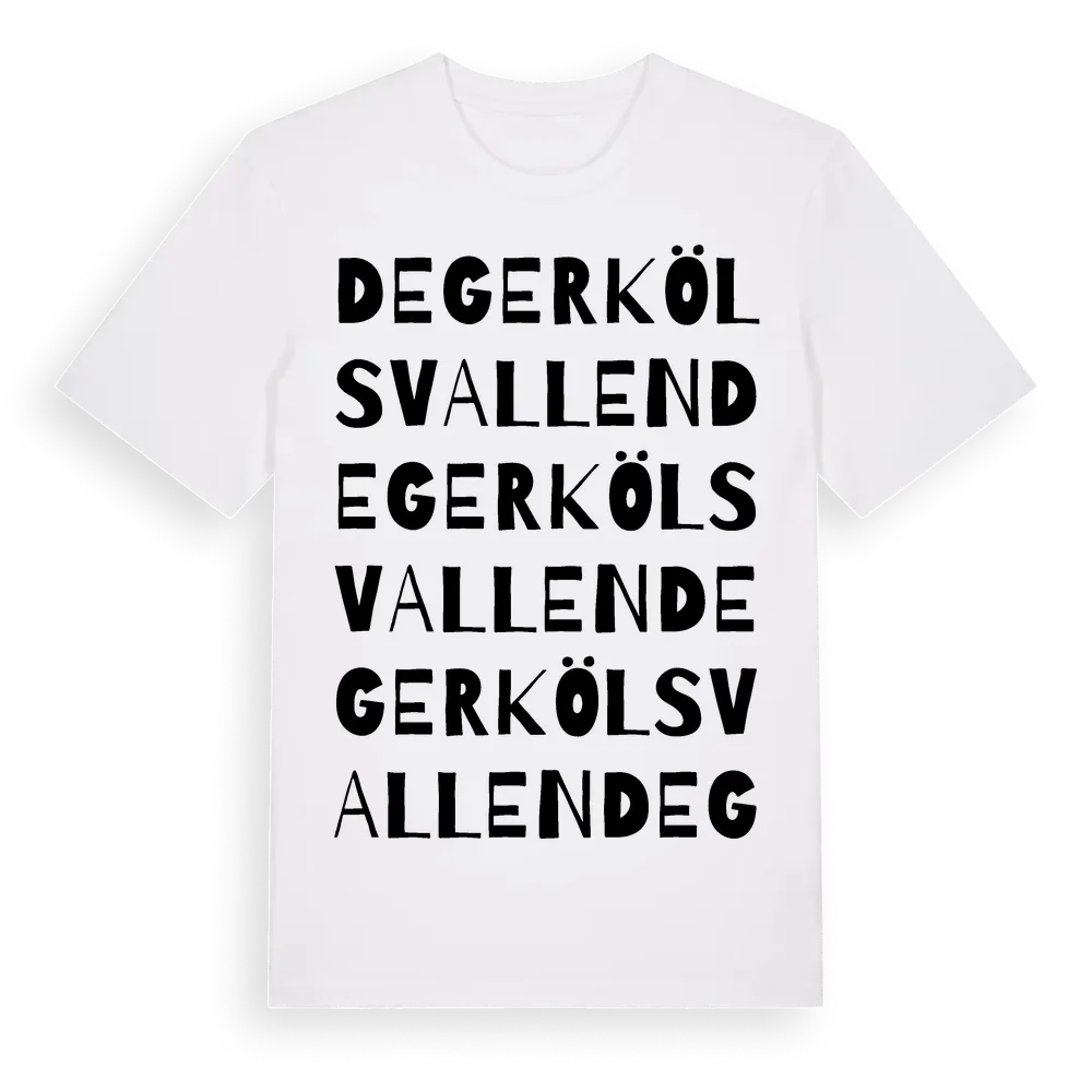 Degerkölsvallen ordlek t-shirt är inspirerad av Degerkölsvallen i Gävleborgs län, Sverige. Tröjan är designad för dig som har en speciell koppling till platsen – oavsett om du bor här, har rötterna här eller bara älskar Degerkölsvallen.