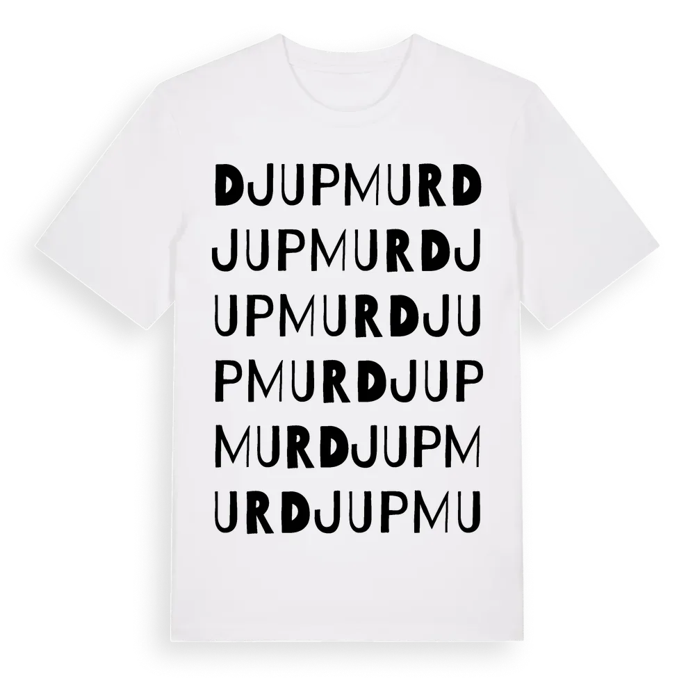 Djupmur ordlek t-shirt är inspirerad av Djupmur i Gävleborgs län, Sverige. Tröjan är designad för dig som har en speciell koppling till platsen – oavsett om du bor här, har rötterna här eller bara älskar Djupmur.