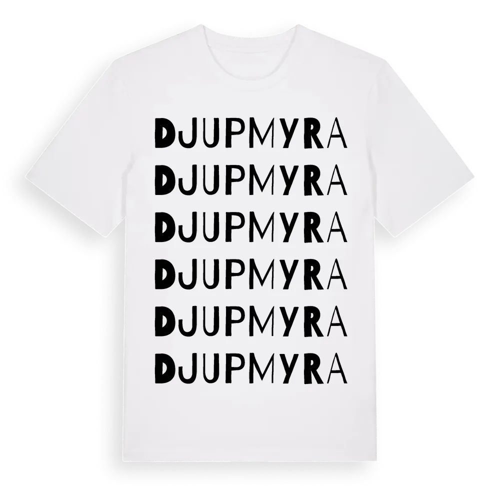 Djupmyra ordlek t-shirt är inspirerad av Djupmyra i Gävleborgs län, Sverige. Tröjan är designad för dig som har en speciell koppling till platsen – oavsett om du bor här, har rötterna här eller bara älskar Djupmyra.