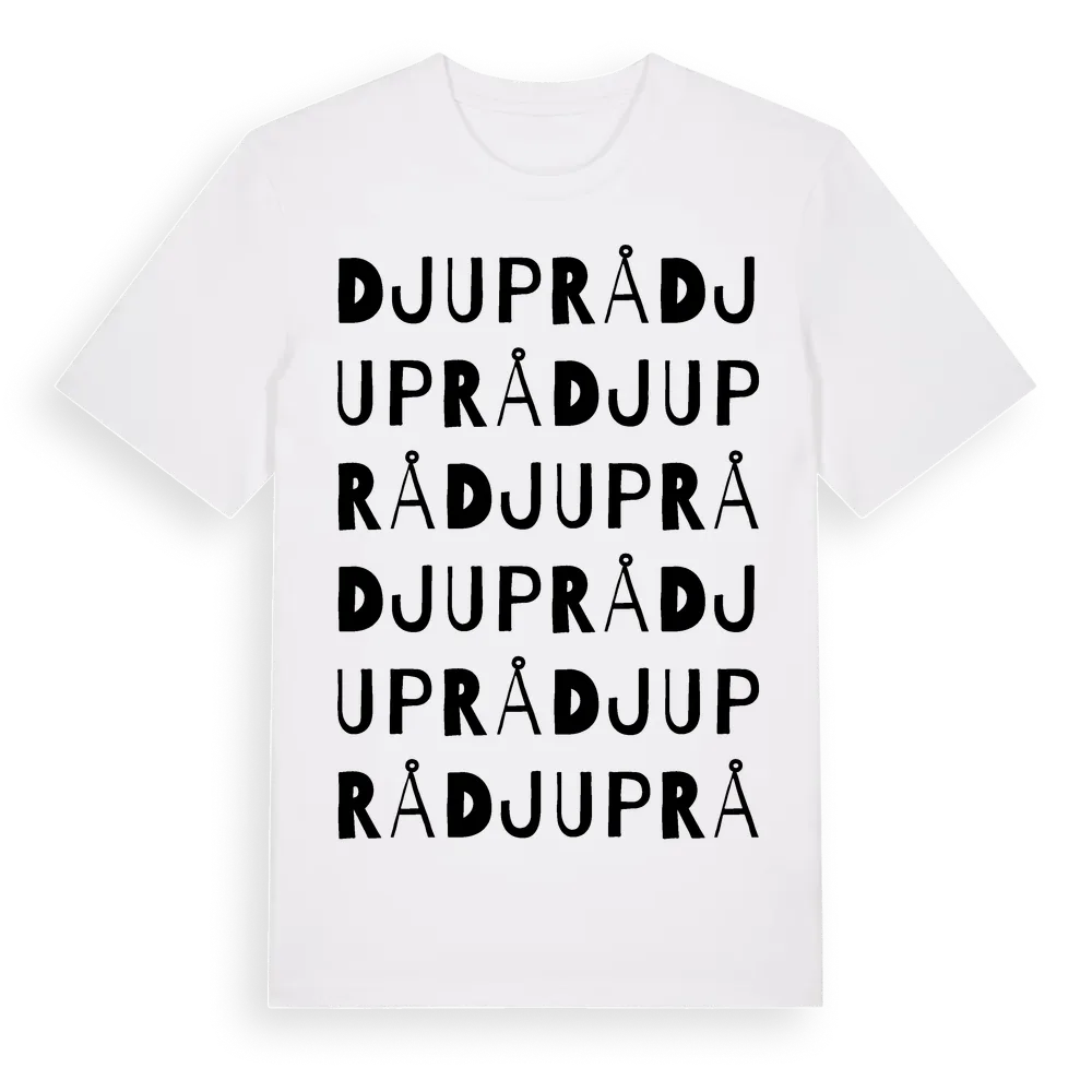 Djuprå ordlek t-shirt är inspirerad av Djuprå i Gävleborgs län, Sverige. Tröjan är designad för dig som har en speciell koppling till platsen – oavsett om du bor här, har rötterna här eller bara älskar Djuprå.