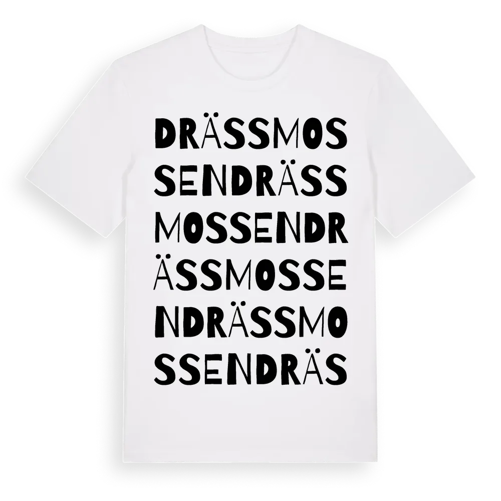 En ordlek byggd på Drässmossens namn. Subtilt och klurig – ett motiv som bara de som verkligen känner platsen fullt ut förstår. Premium bomull, unisex – från Drässmossen i Gävleborgs län.