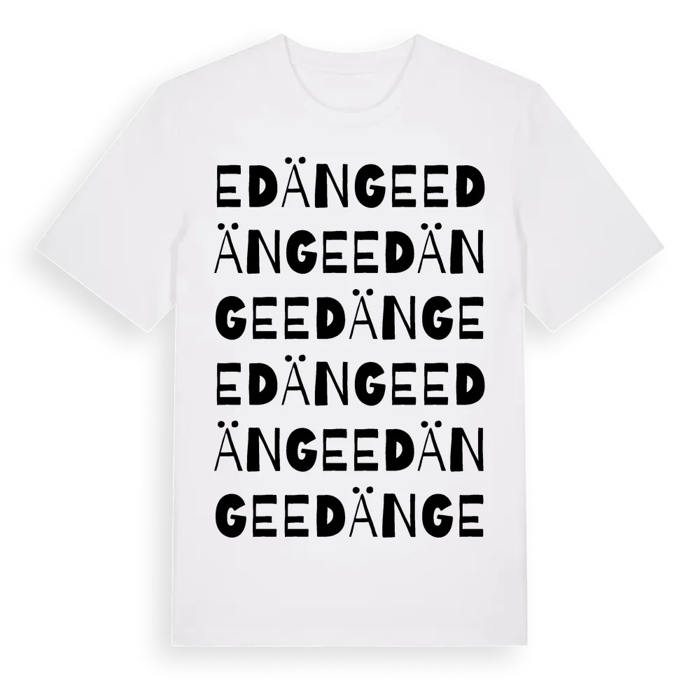 Edänge ordlek t-shirt är inspirerad av byn Edänge i Gävleborgs län, Sverige. Tröjan är designad för dig som har en speciell koppling till platsen – oavsett om du bor här, har rötterna här eller bara älskar Edänge.