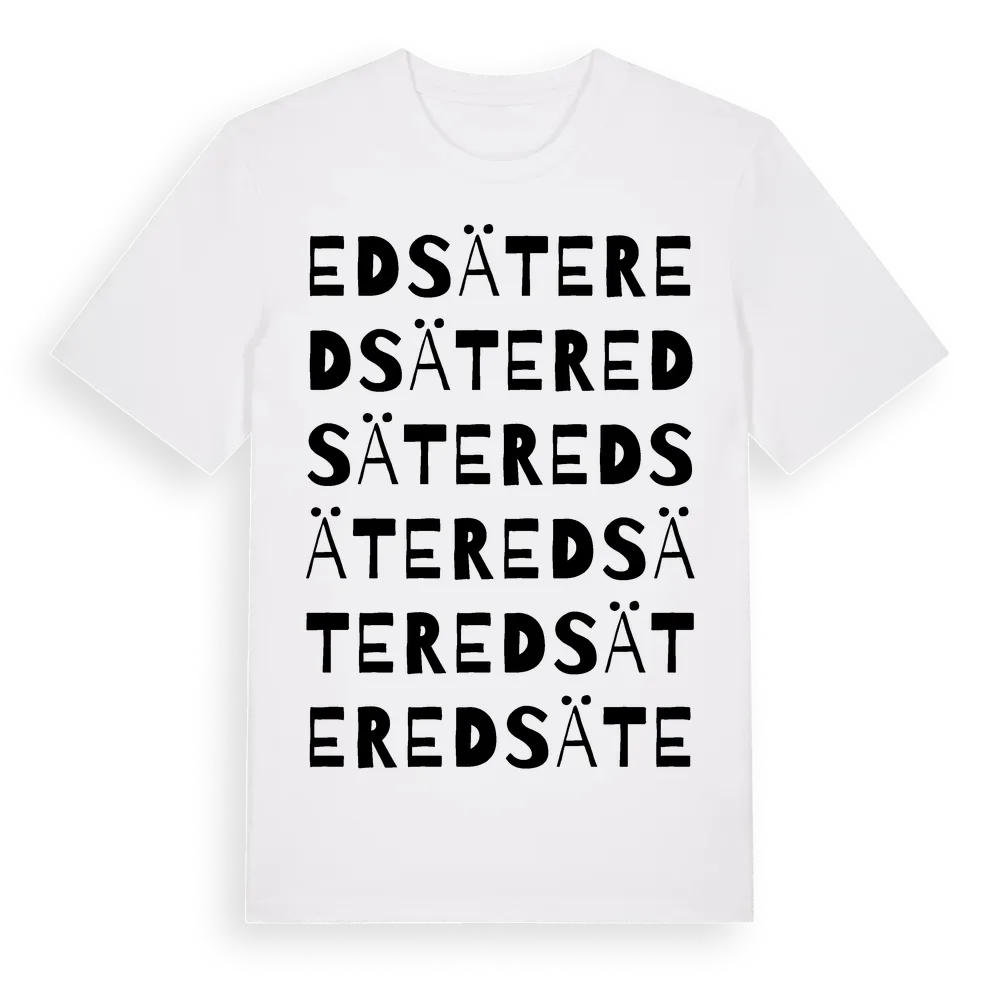 Edsäter ordlek t-shirt är inspirerad av byn Edsäter i Gävleborgs län, Sverige. Tröjan är designad för dig som har en speciell koppling till platsen – oavsett om du bor här, har rötterna här eller bara älskar Edsäter.