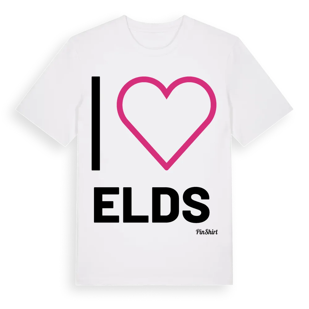 Jag älskar Elds t-shirt stort tryck är inspirerad av Elds i Gävleborgs län, Sverige. Tröjan är designad för dig som har en speciell koppling till platsen – oavsett om du bor här, har rötterna här eller bara älskar Elds.