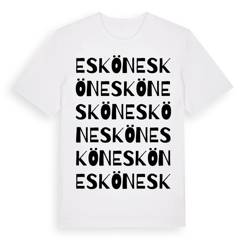 Eskön ordlek t-shirt är inspirerad av byn Eskön i Gävleborgs län, Sverige. Tröjan är designad för dig som har en speciell koppling till platsen – oavsett om du bor här, har rötterna här eller bara älskar Eskön.