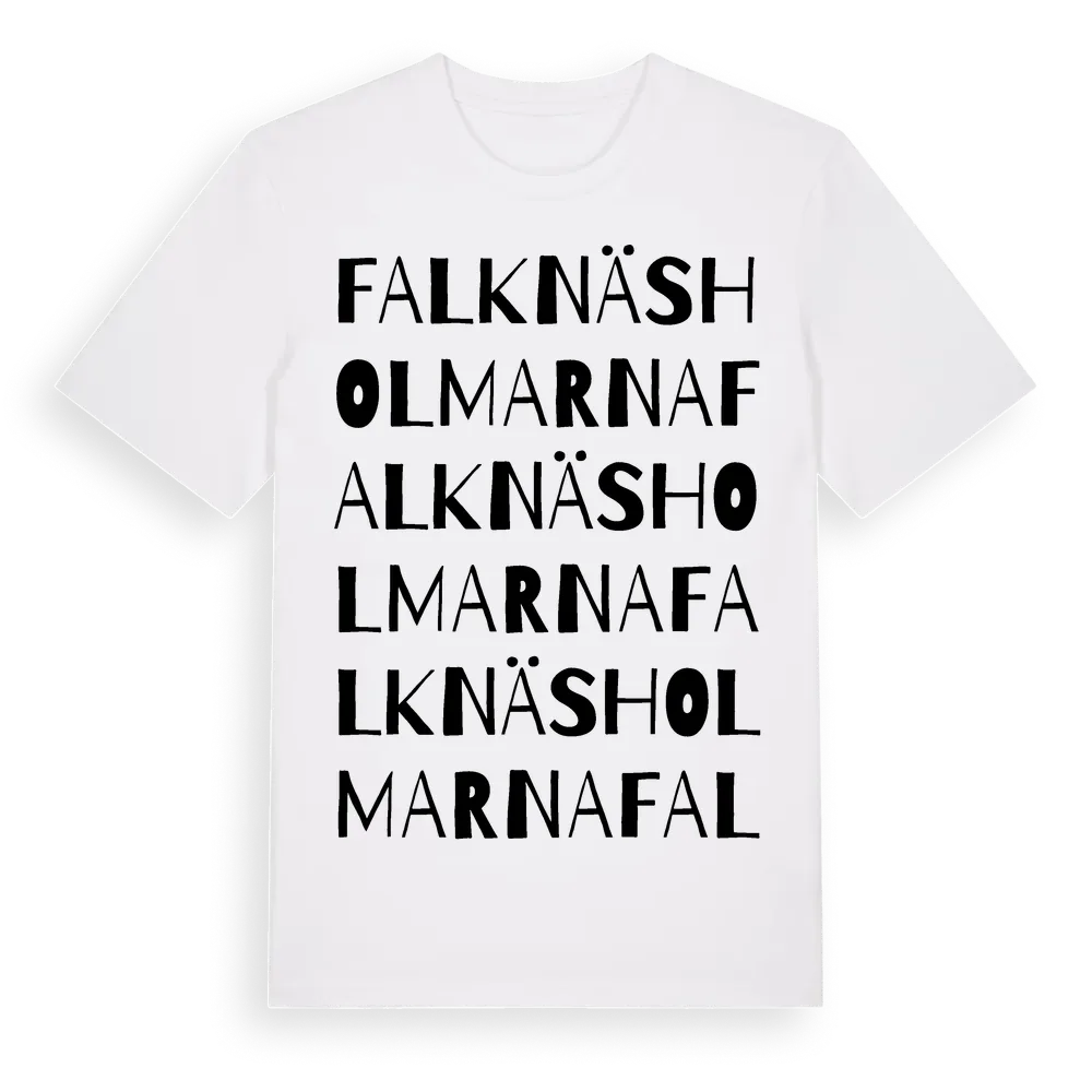 Falknäsholmarna ordlek t-shirt är inspirerad av Falknäsholmarna i Gävleborgs län, Sverige. Tröjan är designad för dig som har en speciell koppling till platsen – oavsett om du bor här, har rötterna här eller bara älskar Falknäsholmarna.