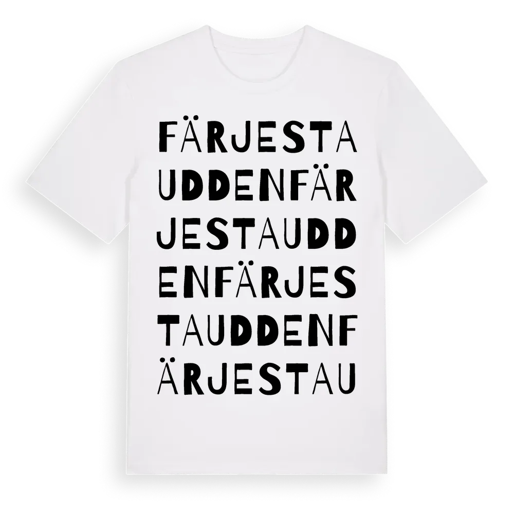 Färjestaudden ordlek t-shirt är inspirerad av Färjestaudden i Gävleborgs län, Sverige. Tröjan är designad för dig som har en speciell koppling till platsen – oavsett om du bor här, har rötterna här eller bara älskar Färjestaudden.