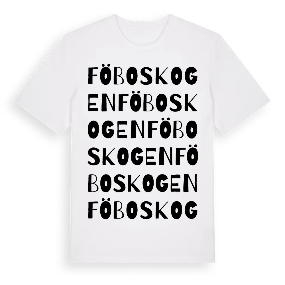 Föboskogen ordlek t-shirt är inspirerad av Föboskogen i Gävleborgs län, Sverige. Tröjan är designad för dig som har en speciell koppling till platsen – oavsett om du bor här, har rötterna här eller bara älskar Föboskogen.