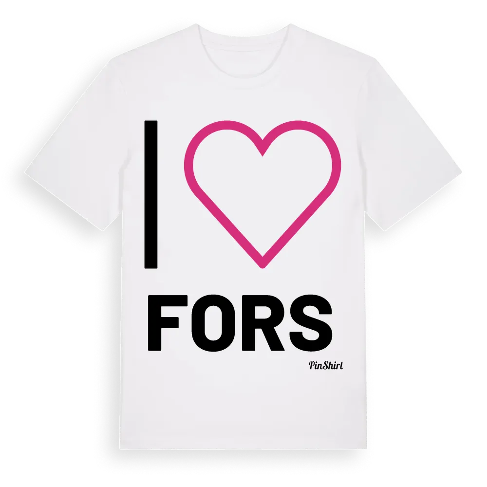 Jag älskar Fors t-shirt stort tryck är inspirerad av Fors i Gävleborgs län, Sverige. Tröjan är designad för dig som har en speciell koppling till platsen – oavsett om du bor här, har rötterna här eller bara älskar Fors.