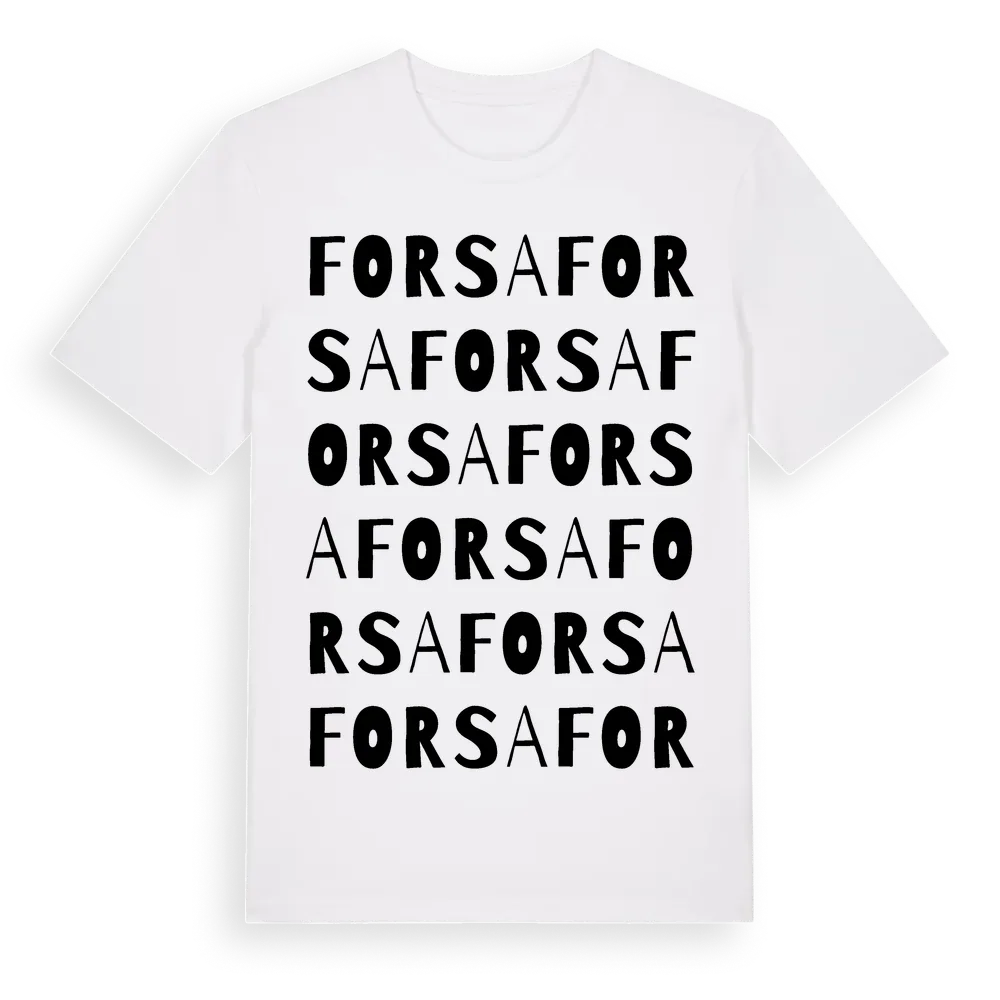 En ordlek byggd på Forsas namn. Subtilt och klurig – ett motiv som bara de som verkligen känner platsen fullt ut förstår. Premium bomull, unisex – från byn Forsa i Gävleborgs län.