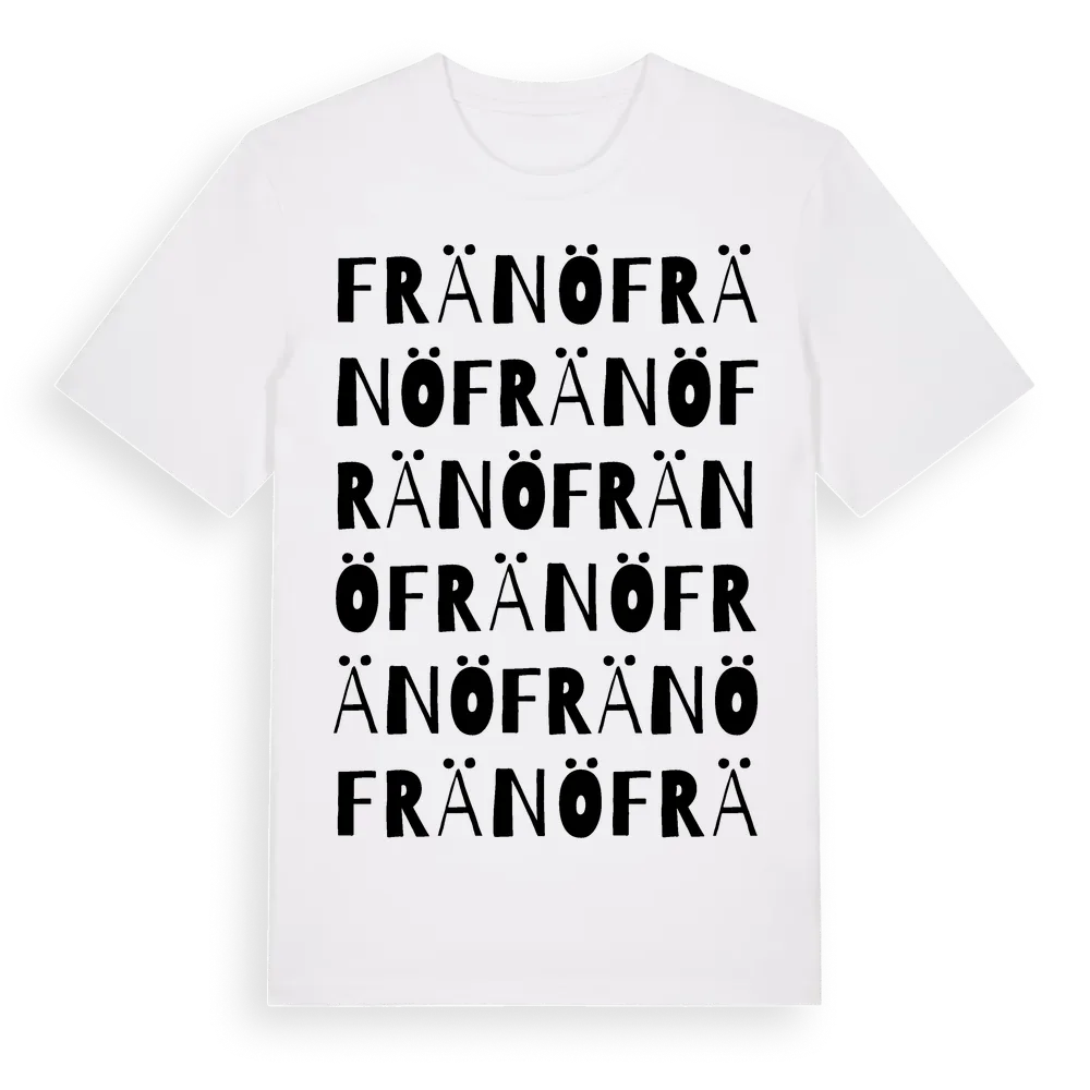Fränö ordlek t-shirt är inspirerad av byn Fränö i Gävleborgs län, Sverige. Tröjan är designad för dig som har en speciell koppling till platsen – oavsett om du bor här, har rötterna här eller bara älskar Fränö.