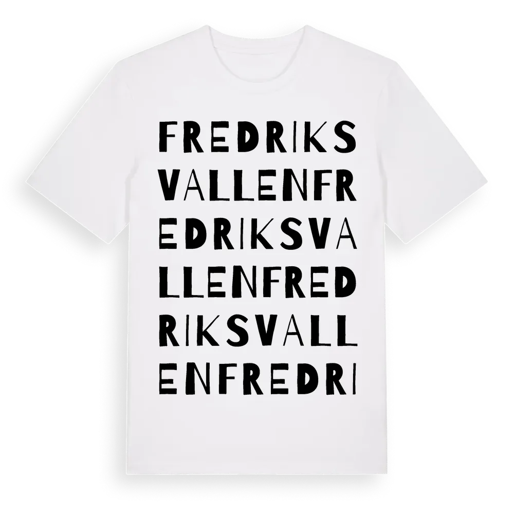 Fredriksvallen ordlek t-shirt är inspirerad av Fredriksvallen i Gävleborgs län, Sverige. Tröjan är designad för dig som har en speciell koppling till platsen – oavsett om du bor här, har rötterna här eller bara älskar Fredriksvallen.