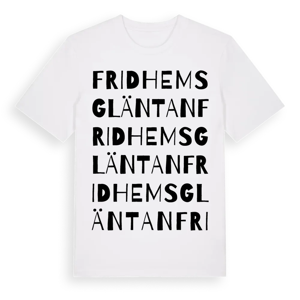 Fridhemsgläntan ordlek t-shirt är inspirerad av stadsdelen Fridhemsgläntan i Gävleborgs län, Sverige. Tröjan är designad för dig som har en speciell koppling till platsen – oavsett om du bor här, har rötterna här eller bara älskar Fridhemsgläntan.