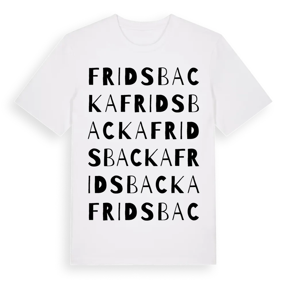 Fridsbacka ordlek t-shirt är inspirerad av byn Fridsbacka i Gävleborgs län, Sverige. Tröjan är designad för dig som har en speciell koppling till platsen – oavsett om du bor här, har rötterna här eller bara älskar Fridsbacka.
