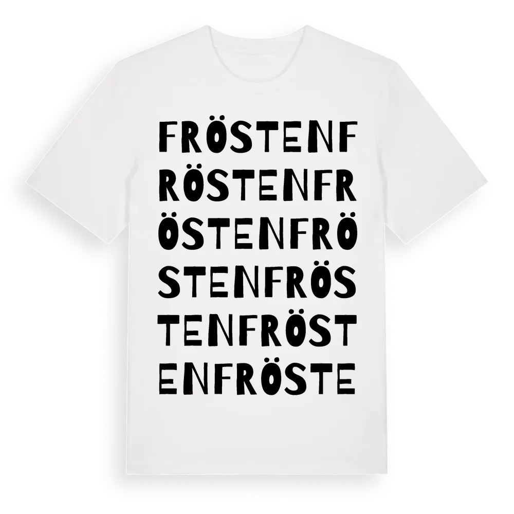 En ordlek byggd på Fröstens namn. Subtilt och klurig – ett motiv som bara de som verkligen känner platsen fullt ut förstår. Premium bomull, unisex – från byn Frösten i Gävleborgs län.