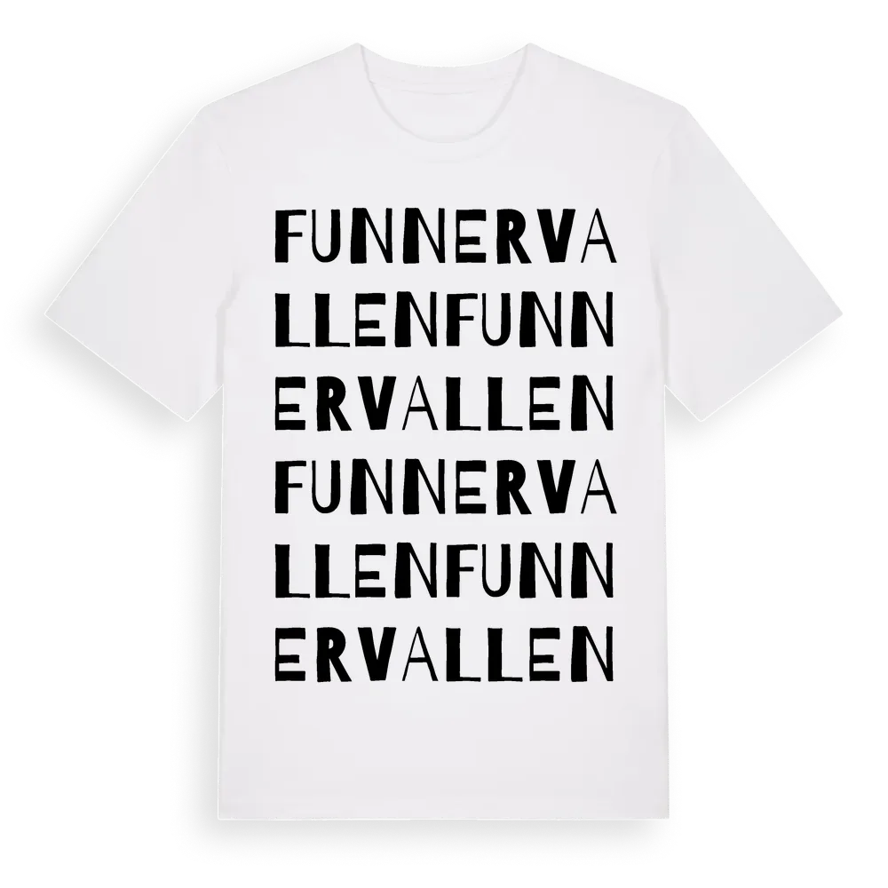Funnervallen ordlek t-shirt är inspirerad av byn Funnervallen i Gävleborgs län, Sverige. Tröjan är designad för dig som har en speciell koppling till platsen – oavsett om du bor här, har rötterna här eller bara älskar Funnervallen.