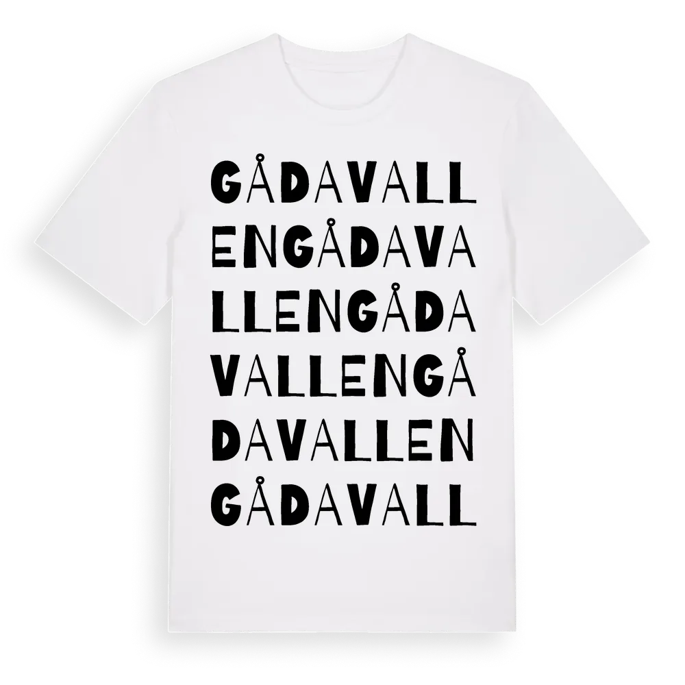 Gådavallen ordlek t-shirt är inspirerad av Gådavallen i Gävleborgs län, Sverige. Tröjan är designad för dig som har en speciell koppling till platsen – oavsett om du bor här, har rötterna här eller bara älskar Gådavallen.
