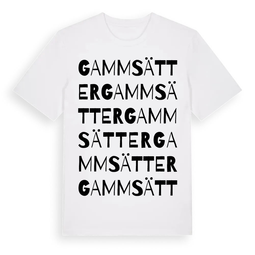 Gammsätter ordlek t-shirt är inspirerad av byn Gammsätter i Gävleborgs län, Sverige. Tröjan är designad för dig som har en speciell koppling till platsen – oavsett om du bor här, har rötterna här eller bara älskar Gammsätter.