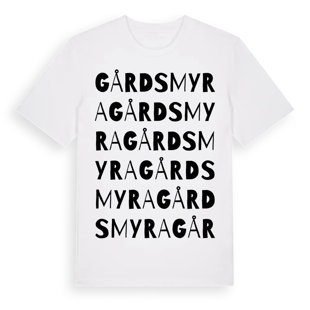 Gårdsmyra ordlek t-shirt är inspirerad av byn Gårdsmyra i Gävleborgs län, Sverige. Tröjan är designad för dig som har en speciell koppling till platsen – oavsett om du bor här, har rötterna här eller bara älskar Gårdsmyra.