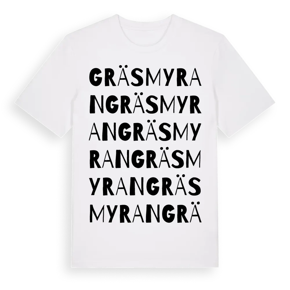 Gräsmyran ordlek t-shirt är inspirerad av byn Gräsmyran i Gävleborgs län, Sverige. Tröjan är designad för dig som har en speciell koppling till platsen – oavsett om du bor här, har rötterna här eller bara älskar Gräsmyran.