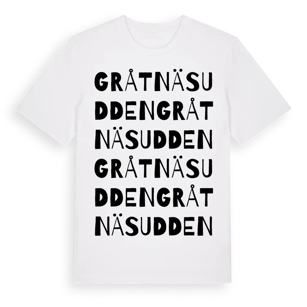 Gråtnäsudden ordlek t-shirt är inspirerad av Gråtnäsudden i Gävleborgs län, Sverige. Tröjan är designad för dig som har en speciell koppling till platsen – oavsett om du bor här, har rötterna här eller bara älskar Gråtnäsudden.