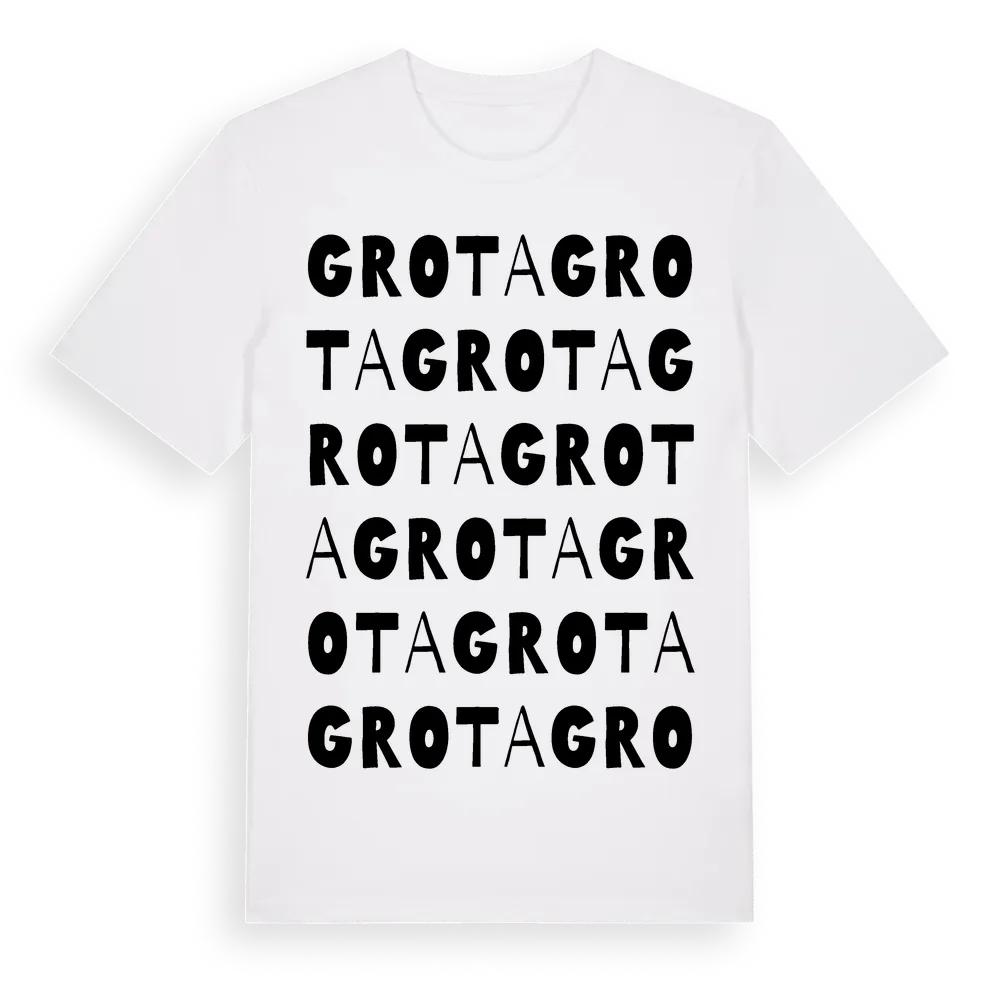 En ordlek byggd på Grotas namn. Subtilt och klurig – ett motiv som bara de som verkligen känner platsen fullt ut förstår. Premium bomull, unisex – från Grota i Gävleborgs län.