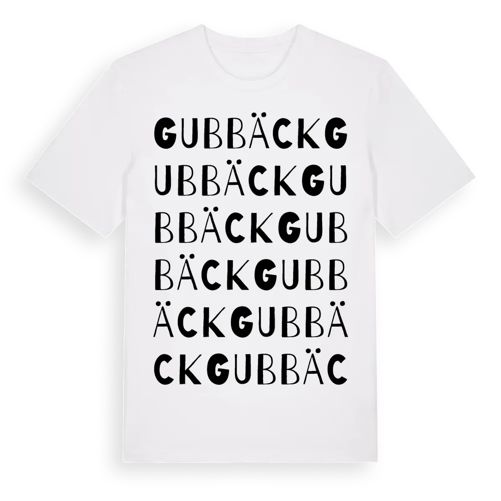 Gubbäck ordlek t-shirt är inspirerad av Gubbäck i Gävleborgs län, Sverige. Tröjan är designad för dig som har en speciell koppling till platsen – oavsett om du bor här, har rötterna här eller bara älskar Gubbäck.