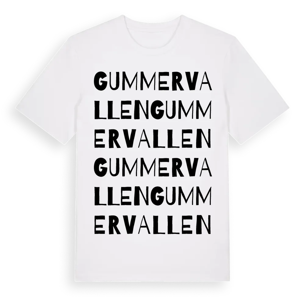 Gummervallen ordlek t-shirt är inspirerad av byn Gummervallen i Gävleborgs län, Sverige. Tröjan är designad för dig som har en speciell koppling till platsen – oavsett om du bor här, har rötterna här eller bara älskar Gummervallen.