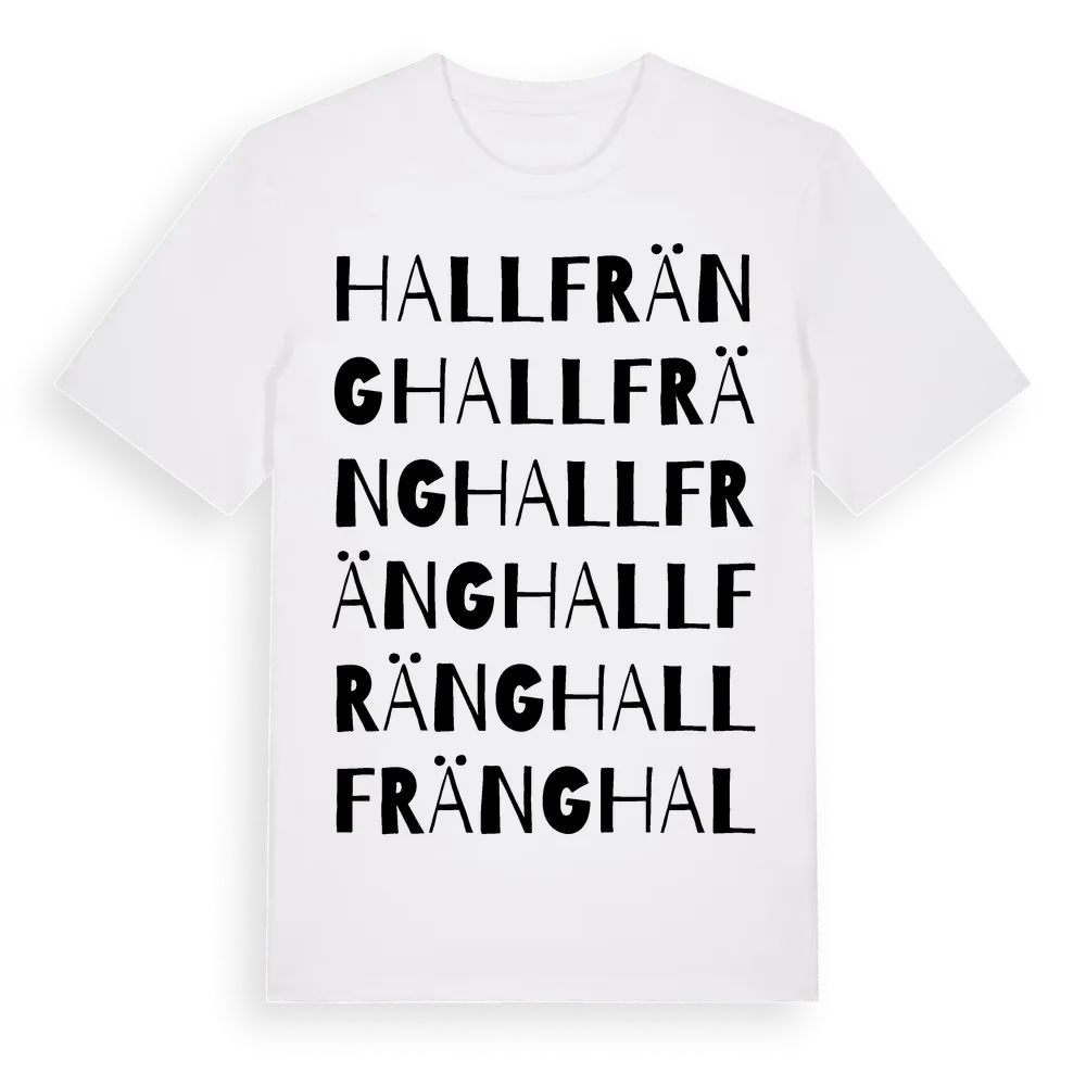 Hallfräng ordlek t-shirt är inspirerad av Hallfräng i Gävleborgs län, Sverige. Tröjan är designad för dig som har en speciell koppling till platsen – oavsett om du bor här, har rötterna här eller bara älskar Hallfräng.