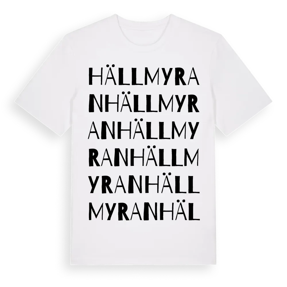 En ordlek byggd på Hällmyrans namn. Subtilt och klurig – ett motiv som bara de som verkligen känner platsen fullt ut förstår. Premium bomull, unisex – från Hällmyran i Gävleborgs län.