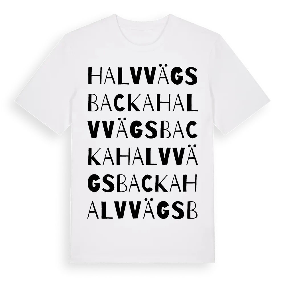 Halvvägsbacka ordlek t-shirt är inspirerad av Halvvägsbacka i Gävleborgs län, Sverige. Tröjan är designad för dig som har en speciell koppling till platsen – oavsett om du bor här, har rötterna här eller bara älskar Halvvägsbacka.