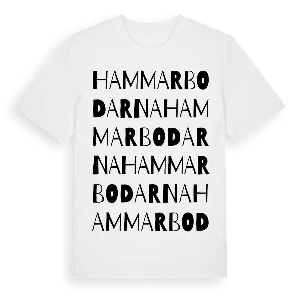 Hammarbodarna ordlek t-shirt är inspirerad av Hammarbodarna i Gävleborgs län, Sverige. Tröjan är designad för dig som har en speciell koppling till platsen – oavsett om du bor här, har rötterna här eller bara älskar Hammarbodarna.