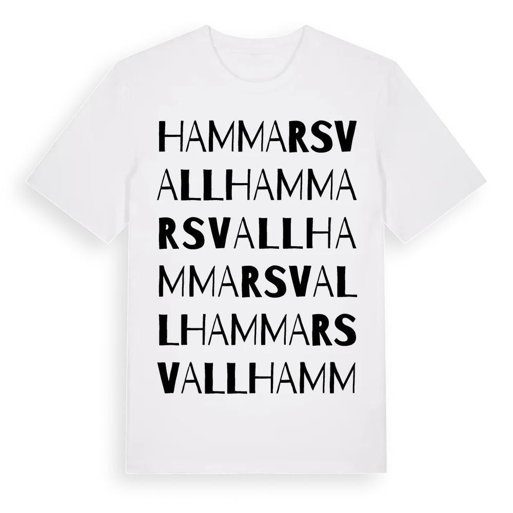 Hammarsvall ordlek t-shirt är inspirerad av byn Hammarsvall i Gävleborgs län, Sverige. Tröjan är designad för dig som har en speciell koppling till platsen – oavsett om du bor här, har rötterna här eller bara älskar Hammarsvall.