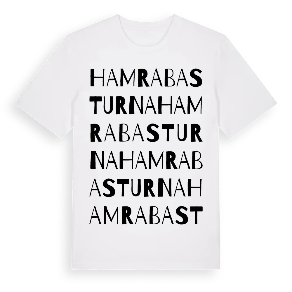 Hamrabasturna ordlek t-shirt är inspirerad av Hamrabasturna i Gävleborgs län, Sverige. Tröjan är designad för dig som har en speciell koppling till platsen – oavsett om du bor här, har rötterna här eller bara älskar Hamrabasturna.