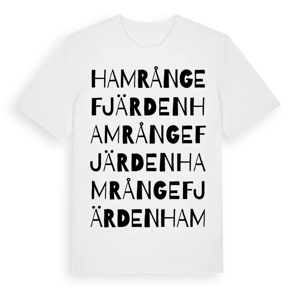 Hamrångefjärden ordlek t-shirt är inspirerad av byn Hamrångefjärden i Gävleborgs län, Sverige. Tröjan är designad för dig som har en speciell koppling till platsen – oavsett om du bor här, har rötterna här eller bara älskar Hamrångefjärden.