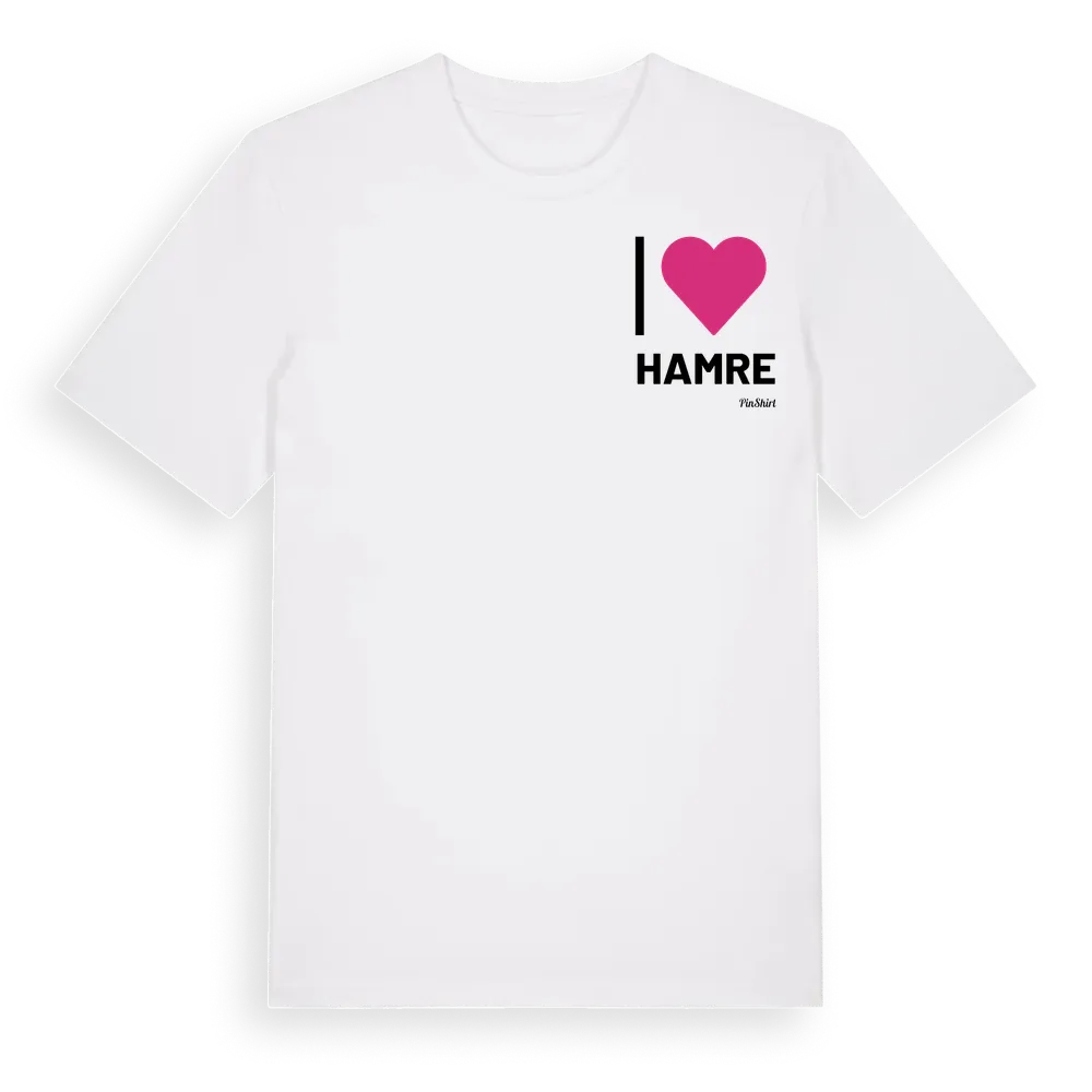 Jag älskar Hamre t-shirt litet tryck är inspirerad av byn Hamre i Gävleborgs län, Sverige. Tröjan är designad för dig som har en speciell koppling till platsen – oavsett om du bor här, har rötterna här eller bara älskar Hamre.