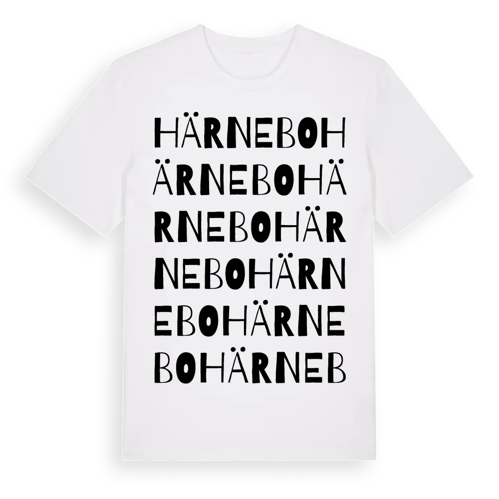Härnebo ordlek t-shirt är inspirerad av byn Härnebo i Gävleborgs län, Sverige. Tröjan är designad för dig som har en speciell koppling till platsen – oavsett om du bor här, har rötterna här eller bara älskar Härnebo.