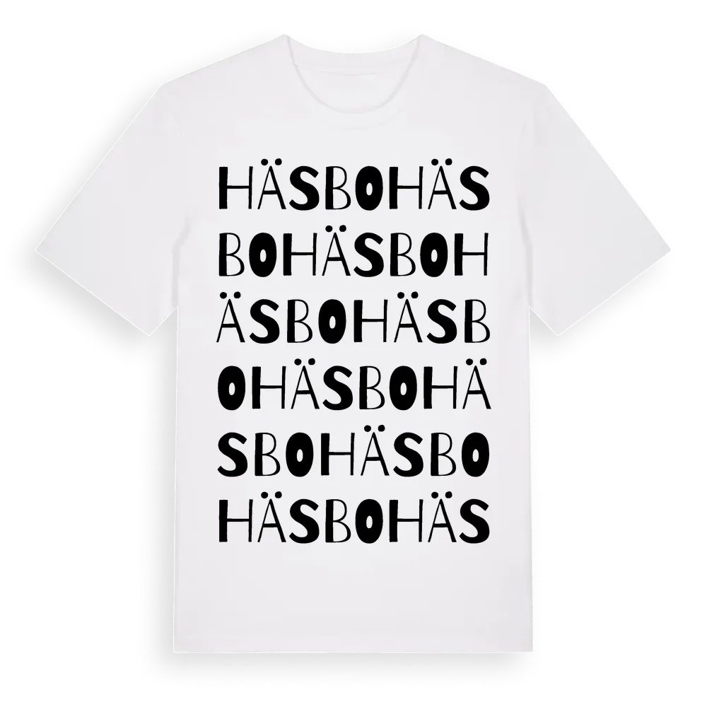 Häsbo ordlek t-shirt är inspirerad av byn Häsbo i Gävleborgs län, Sverige. Tröjan är designad för dig som har en speciell koppling till platsen – oavsett om du bor här, har rötterna här eller bara älskar Häsbo.