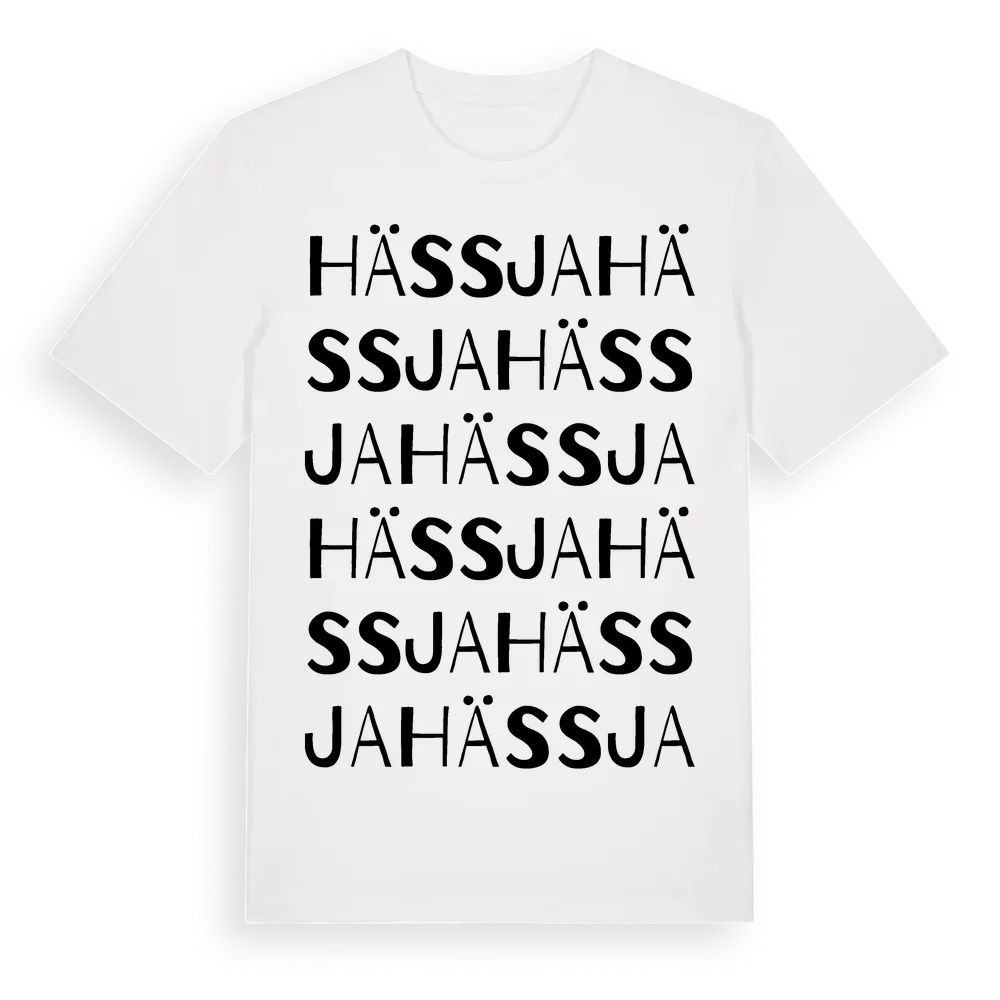 En ordlek byggd på Hässjas namn. Subtilt och klurig – ett motiv som bara de som verkligen känner platsen fullt ut förstår. Premium bomull, unisex – från byn Hässja i Gävleborgs län.