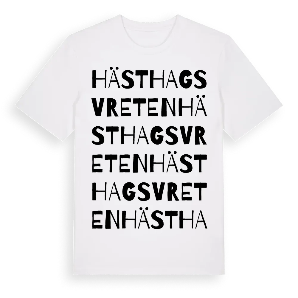 Hästhagsvreten ordlek t-shirt är inspirerad av Hästhagsvreten i Gävleborgs län, Sverige. Tröjan är designad för dig som har en speciell koppling till platsen – oavsett om du bor här, har rötterna här eller bara älskar Hästhagsvreten.