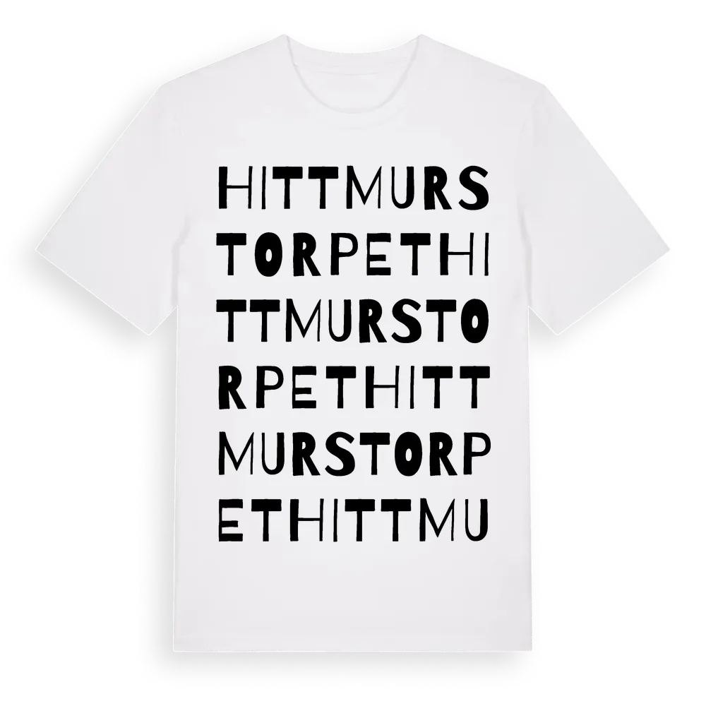 Hittmurstorpet ordlek t-shirt är inspirerad av byn Hittmurstorpet i Gävleborgs län, Sverige. Tröjan är designad för dig som har en speciell koppling till platsen – oavsett om du bor här, har rötterna här eller bara älskar Hittmurstorpet.