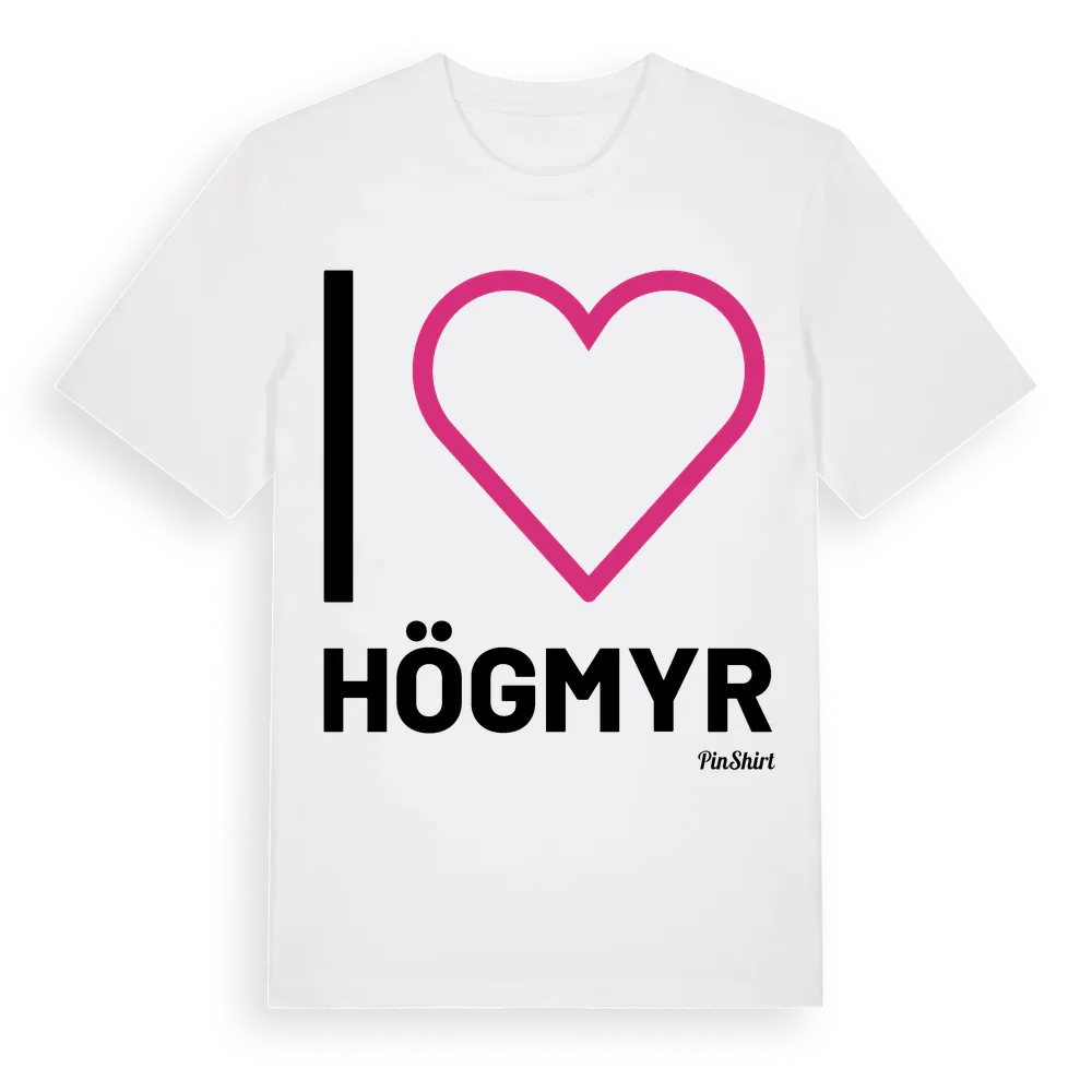 Det klassiska "I ❤ Högmyr"-motivet i stort format som täcker hela bröstet. För dig som vill visa kärleken till Högmyr på riktigt. Premium bomull, unisex – från Högmyr i Gävleborgs län.