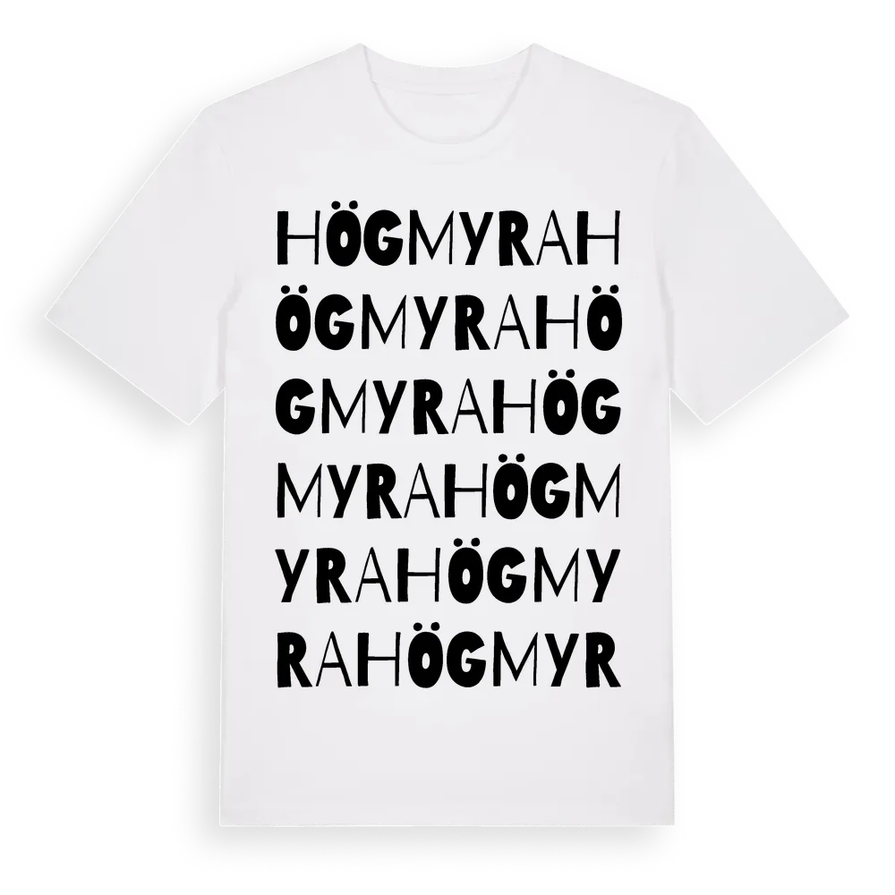 Högmyra ordlek t-shirt är inspirerad av Högmyra i Gävleborgs län, Sverige. Tröjan är designad för dig som har en speciell koppling till platsen – oavsett om du bor här, har rötterna här eller bara älskar Högmyra.