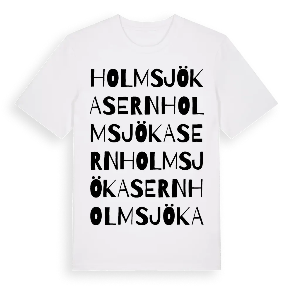 Holmsjö Kasern ordlek t-shirt är inspirerad av Holmsjö Kasern i Gävleborgs län, Sverige. Tröjan är designad för dig som har en speciell koppling till platsen – oavsett om du bor här, har rötterna här eller bara älskar Holmsjö Kasern.